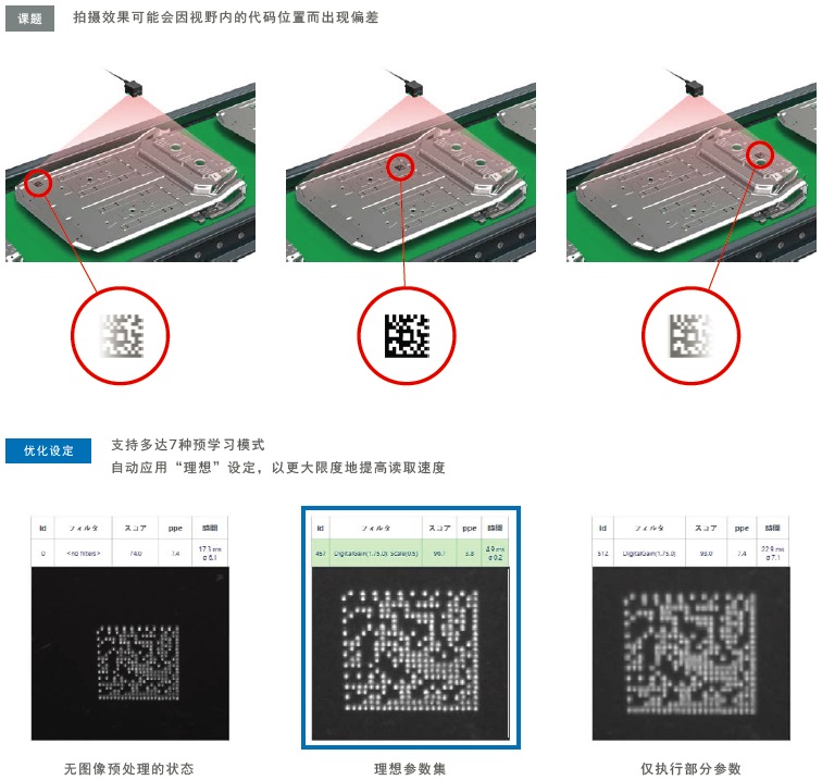 在同一视野内,代码位置的偏差导致代码拍摄效果变化时,此功能非常有效。即使位置有偏差,系统也能通过优化设定实现稳定读取。