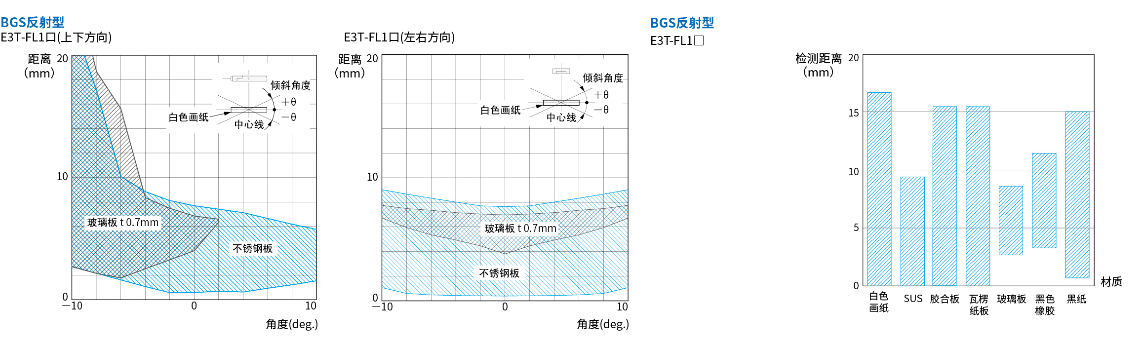 E3T-FL11背景抑制光学原理,对比普通漫反射,拥有更好的角度特性,距离衰减更小,因此在检测黑色、反光、透明物体时更加稳定有效。