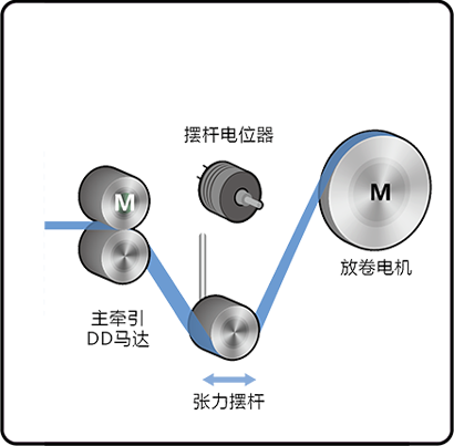 工艺流程中的张力控制机构由变频器+三相异步电机+摆杆机构组成,通过模糊卷径计算技术实现无编码器或卷径测量传感器的卷径计算,简化机械结构,降低成本,提升系统稳定性。