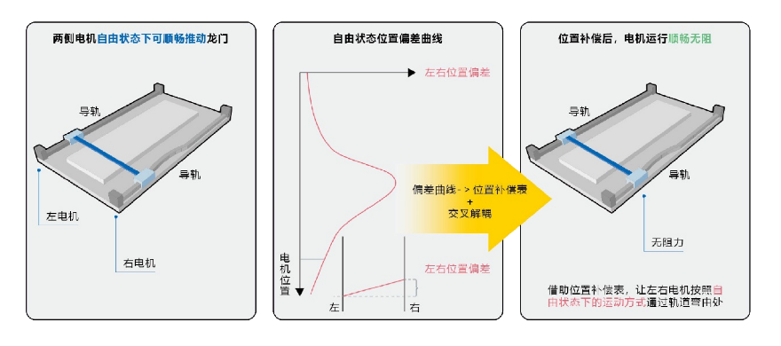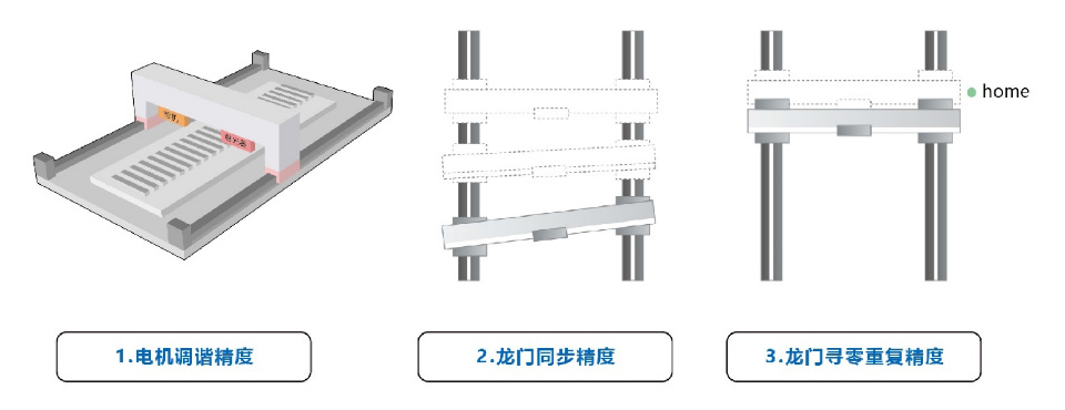 龙门机构的运动精度,受到电机调谐的精度、龙门运动时的同步精度以及龙门寻零重复的精度等因素影响,可能造成最终动作的精度不足。