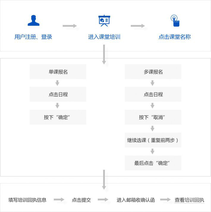 需要事先报名,经过确认方可参加课堂培训,请根据下面流程进行报名:
