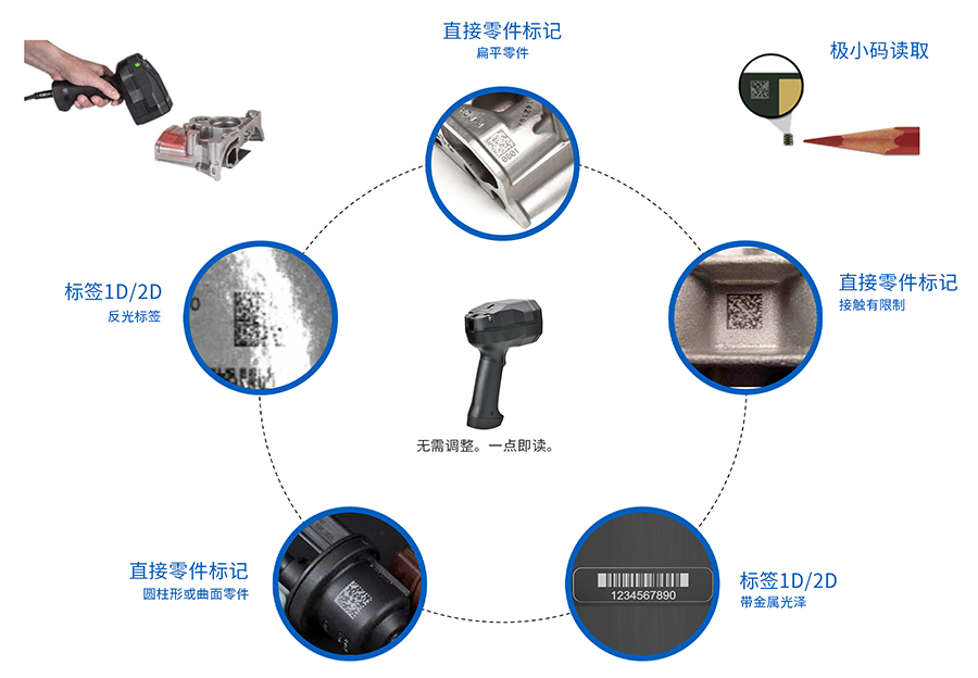 此款智能手持式设备无需用户干预或调整,即可读取各种难以识别的DPM代码和标签(不同代码密度、尺寸、零件几何形状、表面条件和工作距离)。在各种追溯应用中提供开箱即用的出色读取体验。